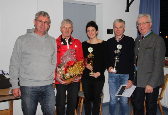 Foto: Vorsitzender Willi Lemberger (links) und Bürgermeister Franz Schedlbauer (rechts) gratulierten dem ältesten Teilnehmer Alfons Laumer (LVR Geiselhöring) sowie den beiden Tagessiegern Pia Holzer und Yves Brack (von links).